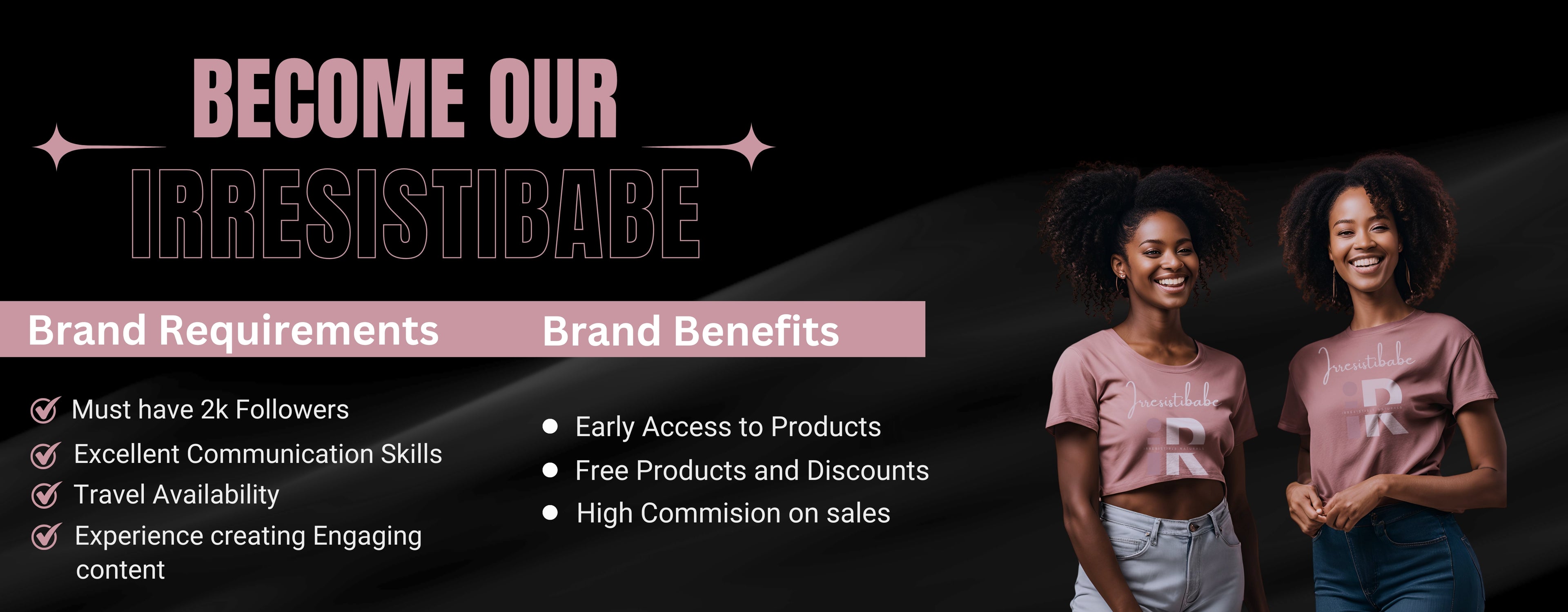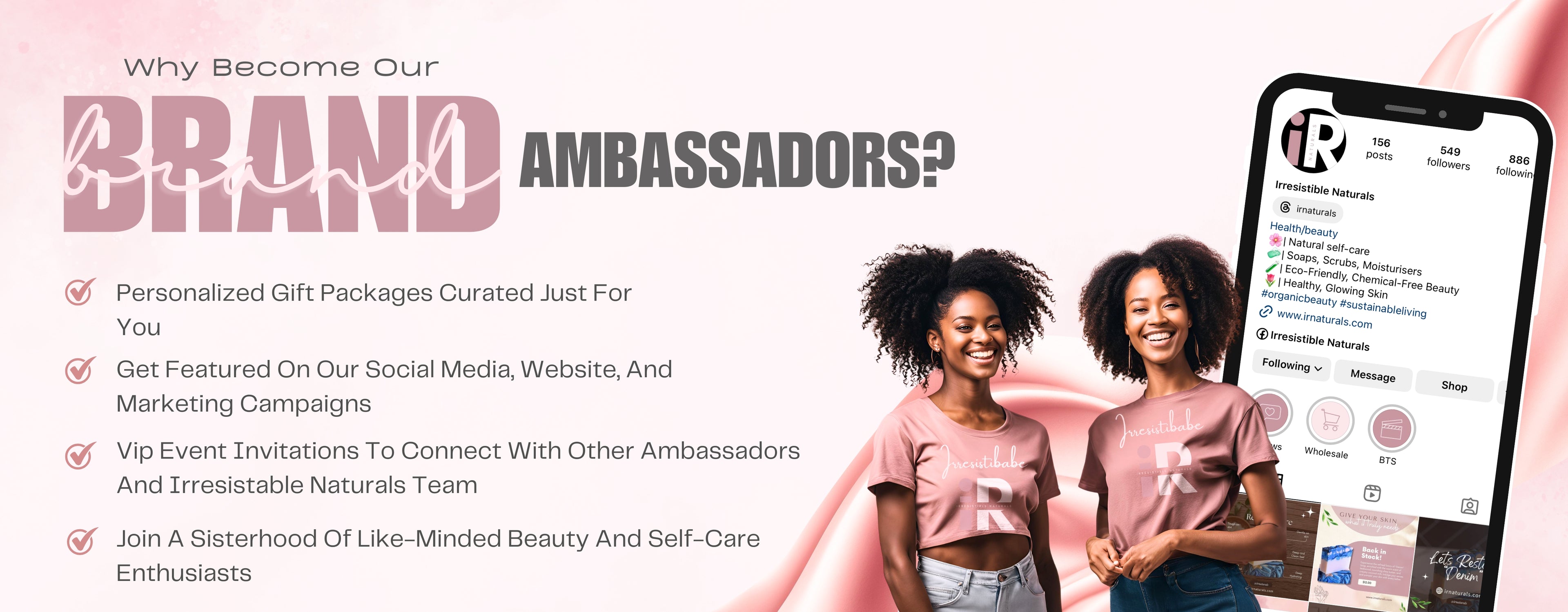 At Irresistible Naturals, we believe self-care is more than a routine—it’s a lifestyle. As an Irresistible Ambassador, you’ll be part of an empowering community that celebrates beauty, confidence, and luxury skincare. Earn exclusive rewards, commissions, and VIP perks while sharing products you love. Whether you’re a content creator, beauty lover, or self-care advocate, this is your chance to turn passion into profit. Ready to glow, grow, and get rewarded? Apply now and start your Irresistible journey today! ✨💖